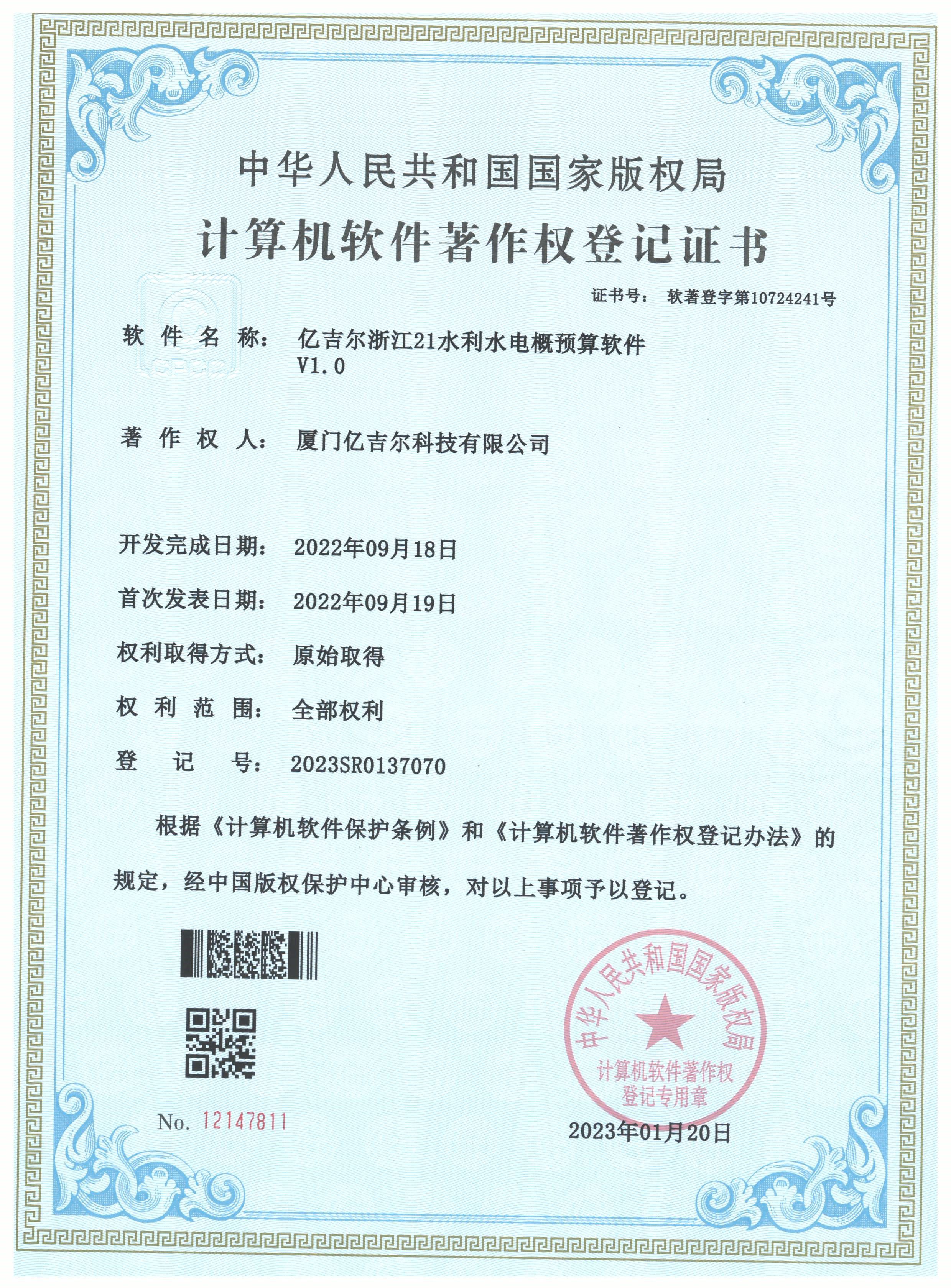億吉爾浙江21水利水電概算軟件登記證書 發(fā)布日期:2023年11月22日 瀏覽次數(shù):1922 關(guān)鍵字: 公司 1/1億吉爾浙江21水利水電概算軟件登記證書(2022R11L1869444)