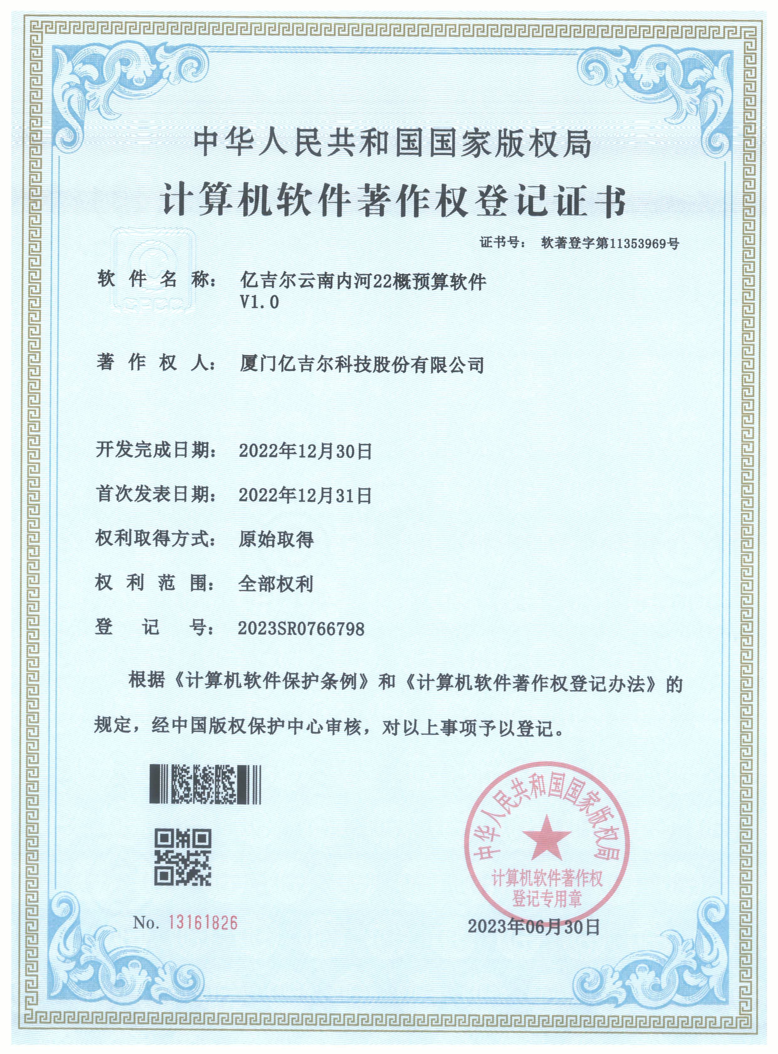 億吉爾云南內(nèi)河22概預(yù)算軟件登記證書 發(fā)布日期:2023年11月22日 瀏覽次數(shù):1851 關(guān)鍵字: 公司 1/1億吉爾云南內(nèi)河22概預(yù)算軟件登記證書(2023R11L0546651)