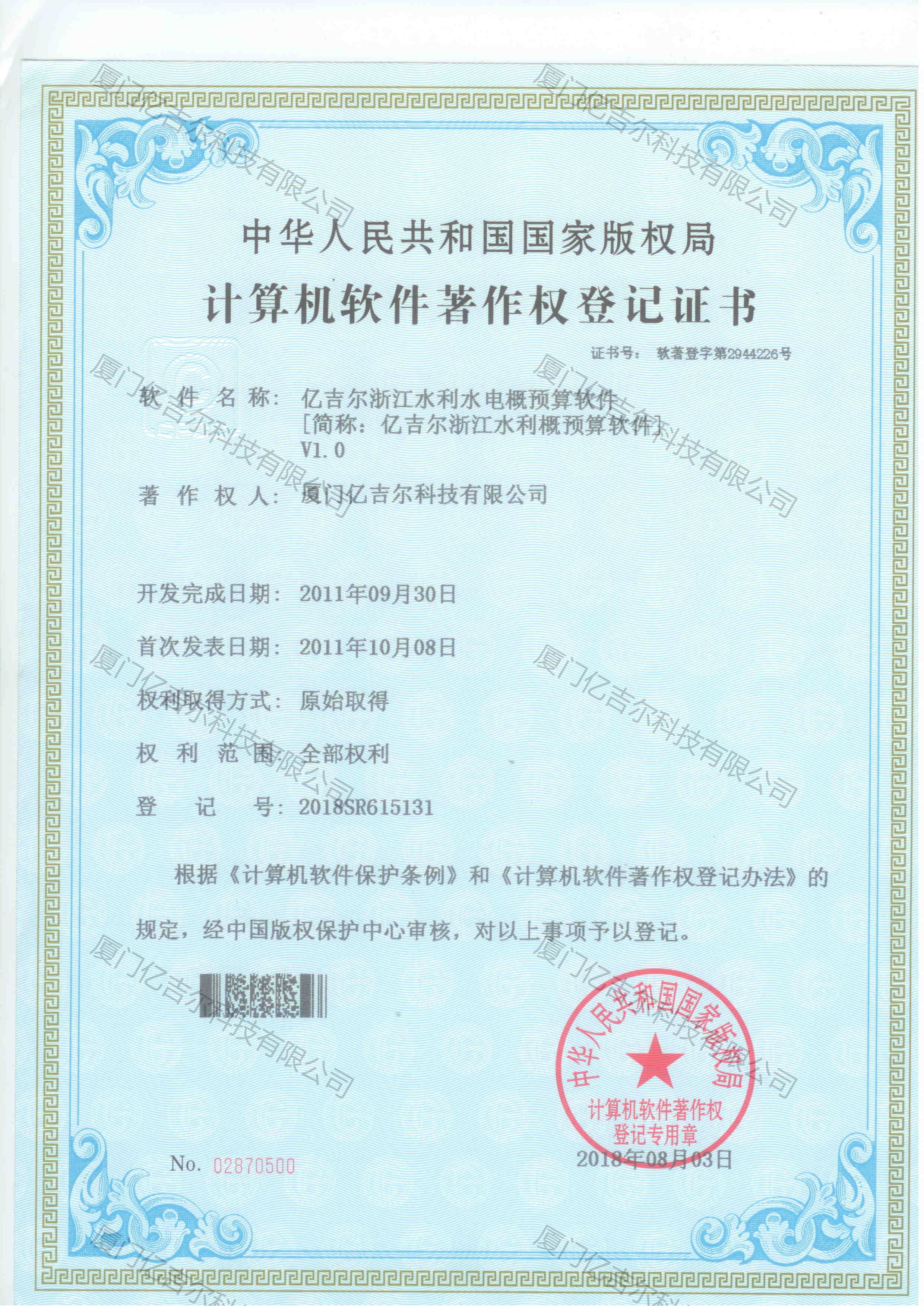 億吉爾浙江水利水電概預(yù)算軟件著作權(quán)登記證書 發(fā)布日期:2018年08月03日 瀏覽次數(shù):3260 關(guān)鍵字: 公司 1/1億吉爾浙江水利水電概預(yù)算軟件著作權(quán)登記證書